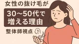 髪の悩み・トラブル女性の抜け毛が30〜50代で増える理由【整体師視点】 30〜50代の女性に抜け毛が増えやすい一般的な理由を整体師の視点から整理。体の変化や生活習慣とのつながりをわかりやすく説明します。髪の悩み・トラブル