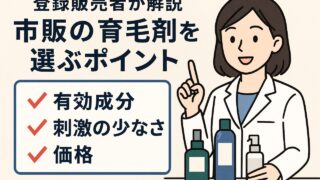 プロが教える髪と体の知識登録販売者が解説:市販の育毛剤を選ぶポイント 市販の育毛剤を選ぶ際のチェックポイントを登録販売者の視点で解説。目的や特徴を理解し、自分に合う商品を選ぶための一般的な考え方を紹介します。プロが教える髪と体の知識