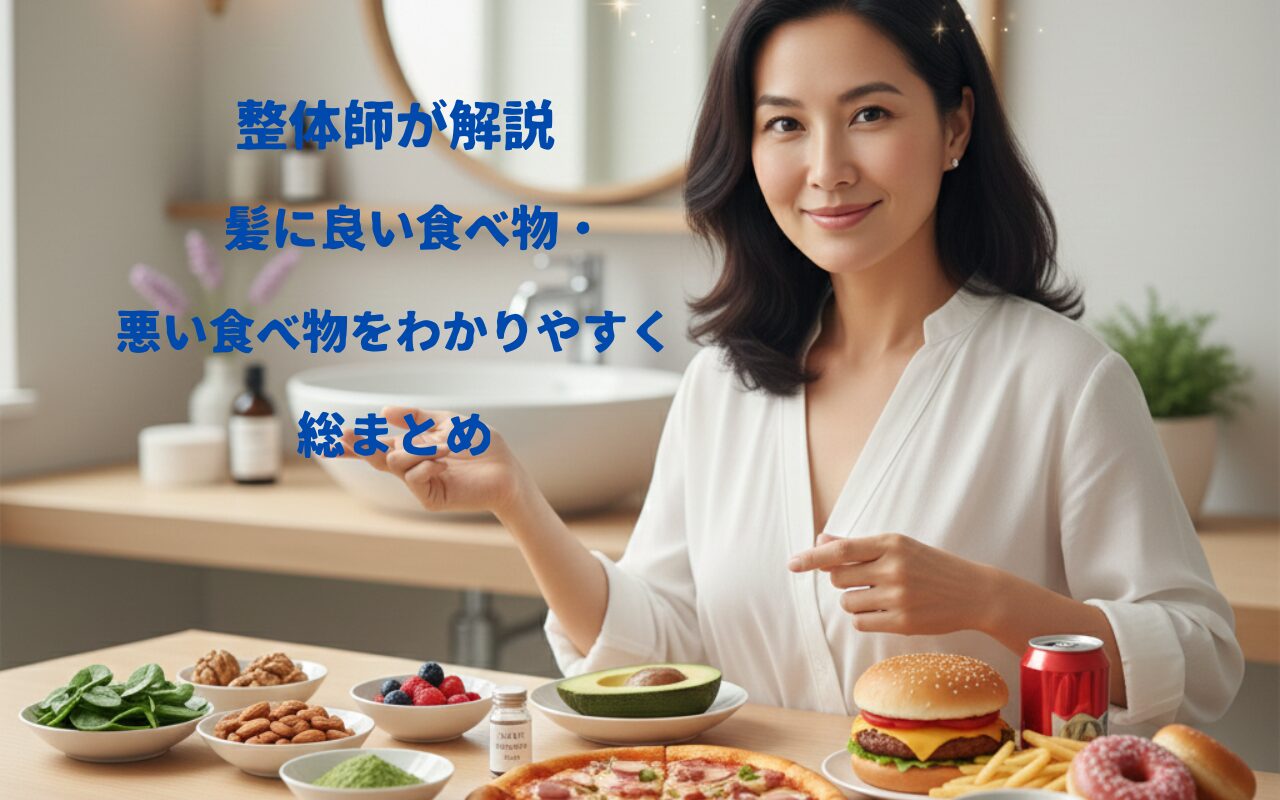 もちろん、医療が必要なケースもありますが、多くの場合、日常的な食事や生活習慣を見直すだけでも、髪が健やかに見える状態を支えやすくなります。本記事では、整体師の視点から「髪に良い食べ物」「気をつけたい食べ物」をわかりやすくまとめました。