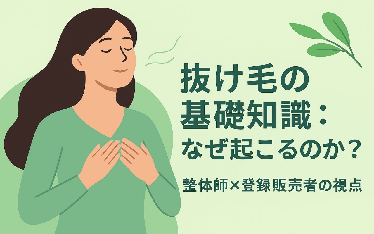 「最近、抜け毛が増えた気がする…」「シャンプーのたびに不安になる」——こうした声を整体院や薬局で多く聞きます。私は整体師として30年以上、多くの方の体の変化を見てきました。また登録販売者として、髪と頭皮に関する一般的な知識にも接してきました。本記事では、抜け毛の基礎となる部分を、専門用語をできるだけ使わずにわかりやすく解説します。医学的診断や治療の代替ではなく、一般的に知られている要因に絞った内容です。